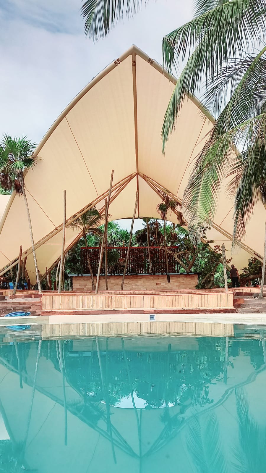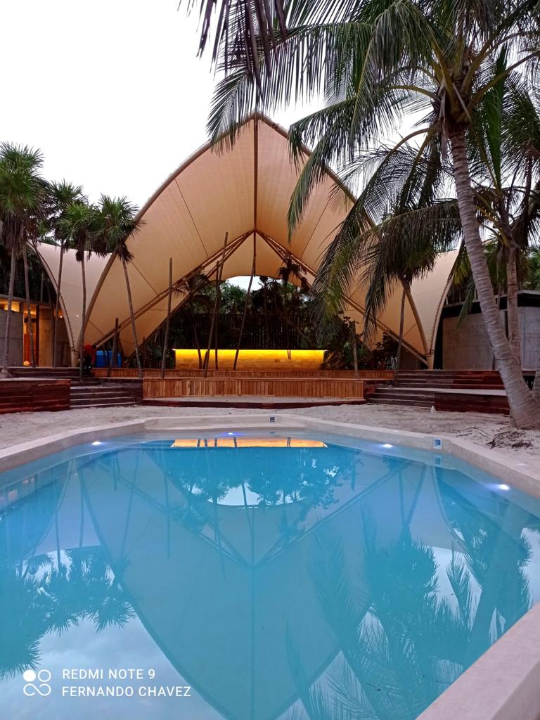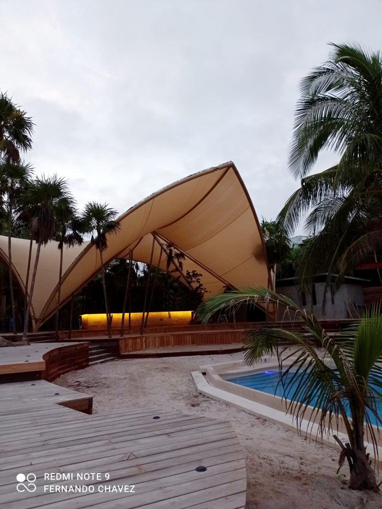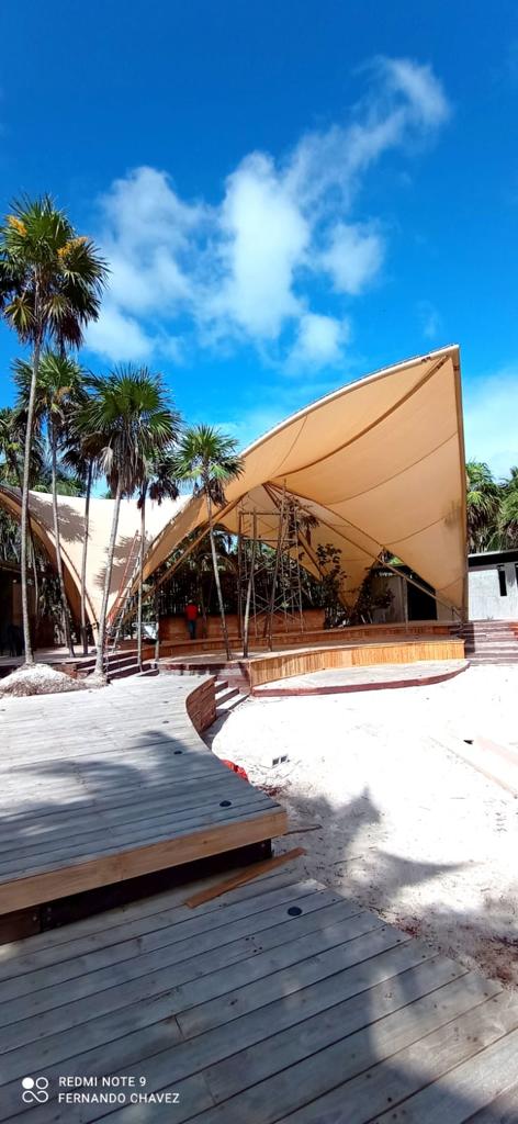 Velaria para explanada de un área de 295.2 m2, con sistema estructural a base de bambú y cables de acero inoxidable, con instalación de malla sombra.