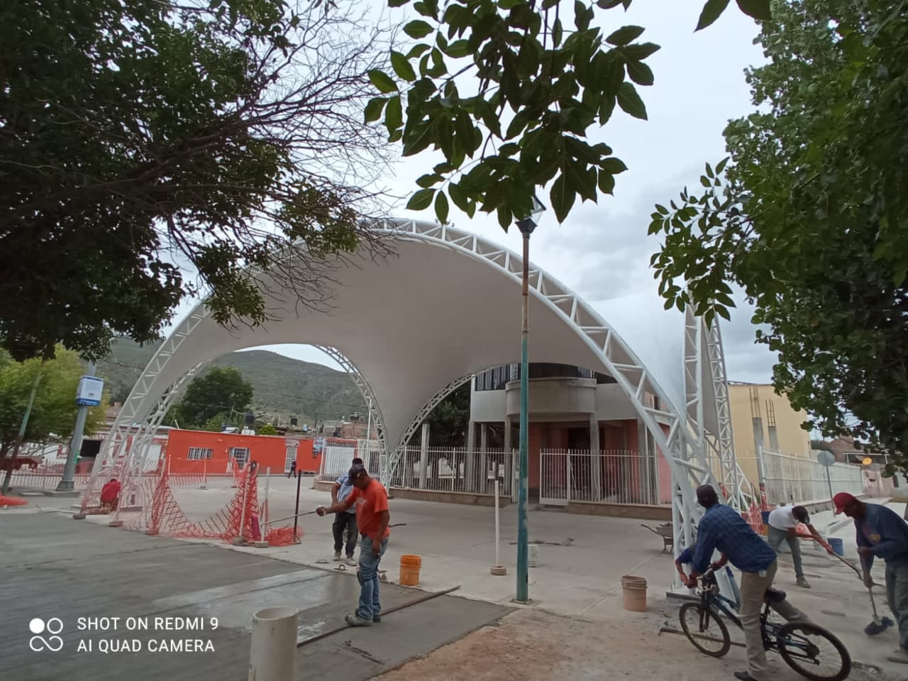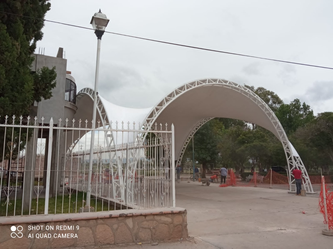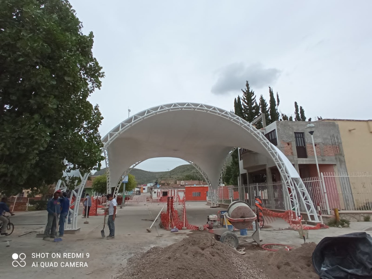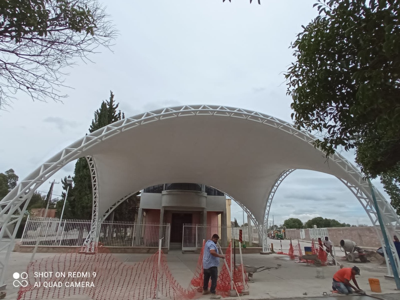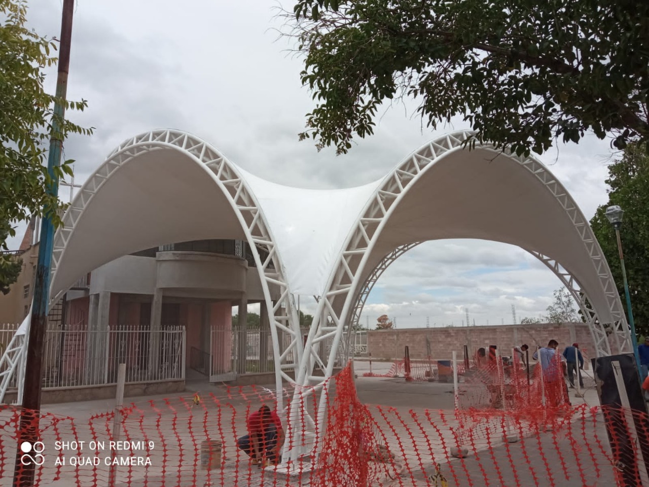 Velaria para explanada, con un área de 225 m2 y sistema estructural a base de tubería y cables de acero inoxidable con membrana de una capa.