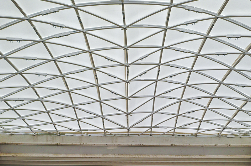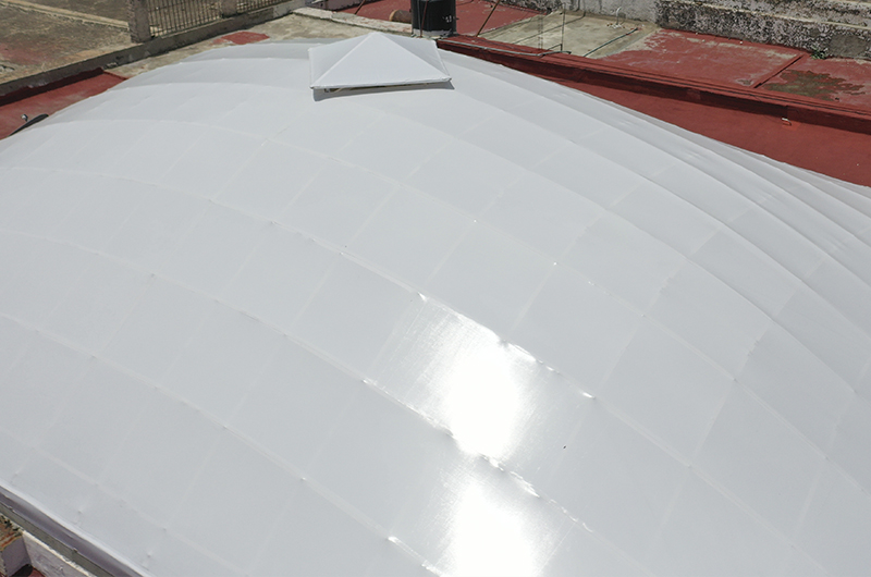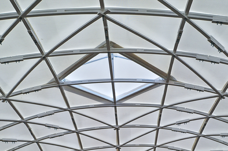 Sistema estructural tipo Gridshell, elaborado con madera de pino de primera calidad usando conexiones atornilladas y cubierta de membrana estructural.