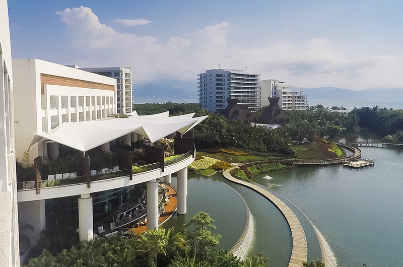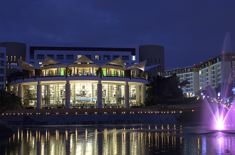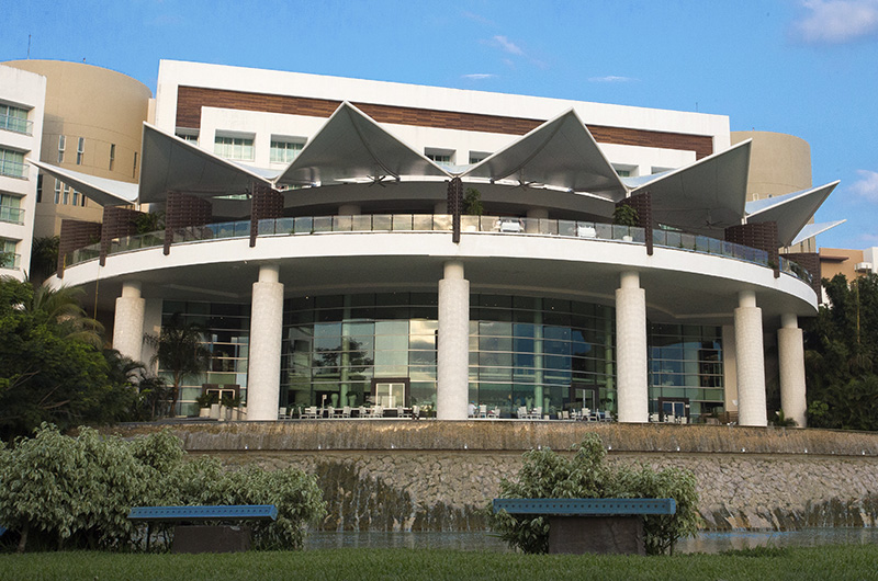 Cubierta área de restaurante. Sistema estructural a base de tubería de acero y cables de acero inoxidable con membrana de una capa, geometría de doble curvartura invertida. Estructura de acero A572 Gr. 50