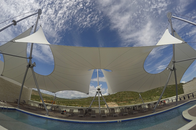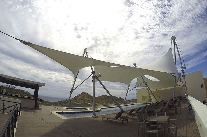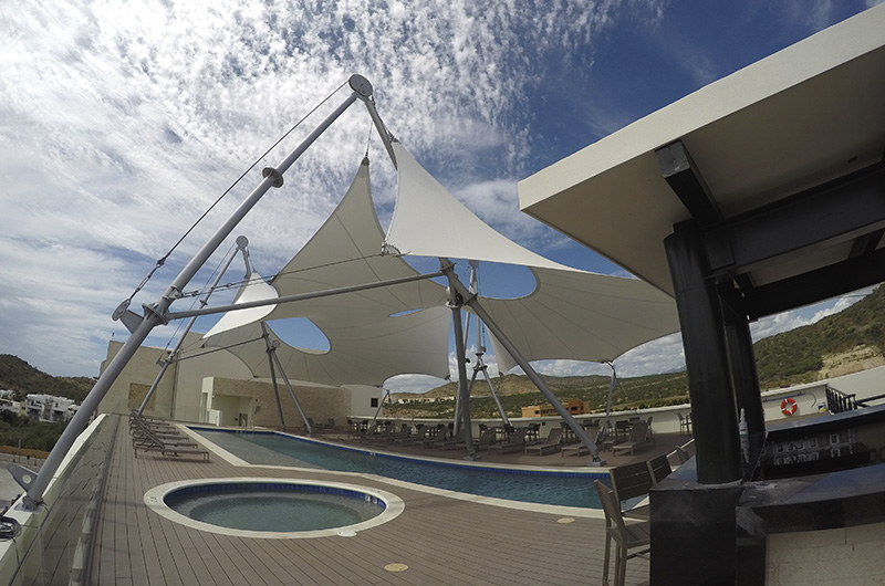 Cubierta área de bar y terraza con alberca panorámica en Penthouse. Sistema estructural a base de tubería de acero y cables de acero inoxidable con membrana de una capa, geometría de doble curvatura invertida, sistema de fácil desmontaje en caso de huracanes. Estructura de acero A572 Gr. 50