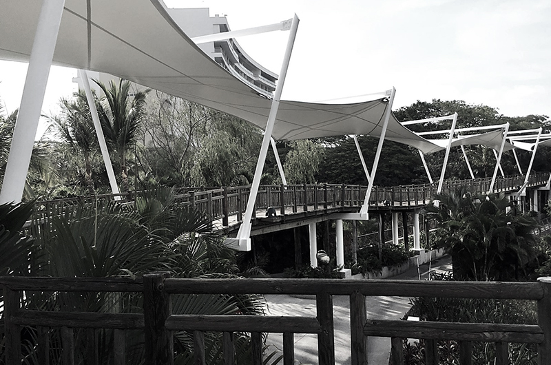 Corredores peatonales en desarrollo turistico. Sistema estructural a base de tubería de acero y cables de acero inoxidable con membrana de una capa, geometría de doble curvartura invertida. Estructura de acero A572 Gr. 50