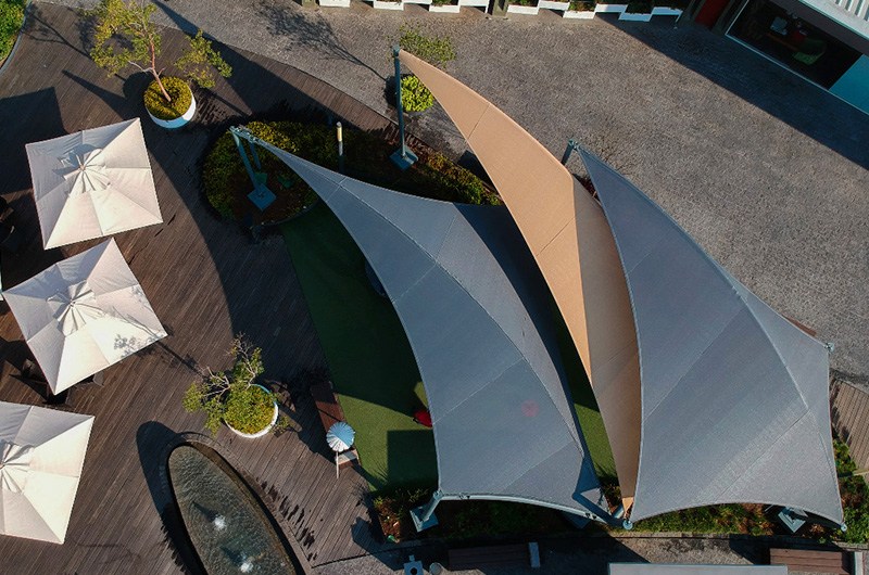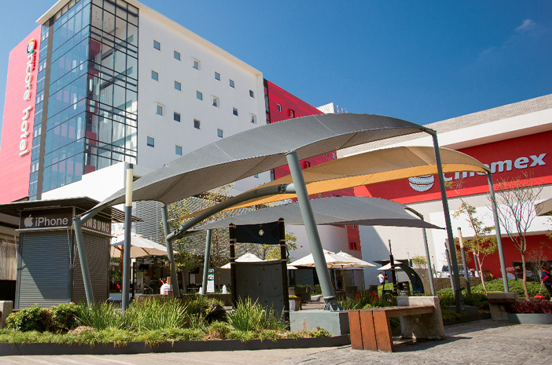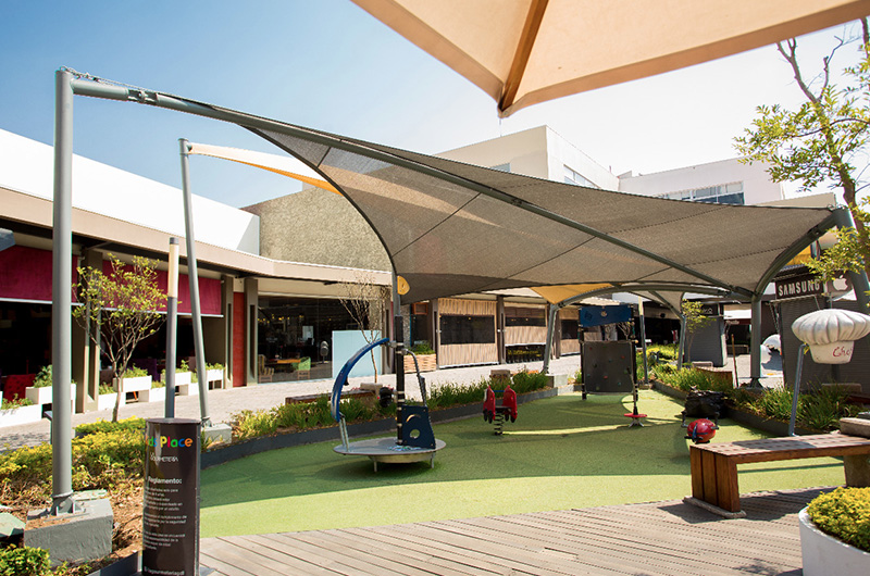 Cubierta área de playground para niños. Sistema estructural a base de tubería de acero y cables de acero con mallasombra de una capa, geometría de doble curvartura inverrtida. Estructura de acero A572 Gr. 50