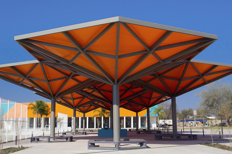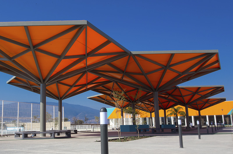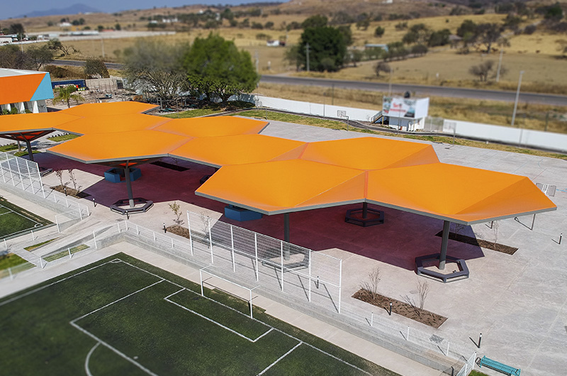 Cubierta para captación pluvial, sirve para llenar un sistema de cisternas durante el temporal. Sistema estructural hexagonal, con capa simple de membrana con geometría de conica invertida